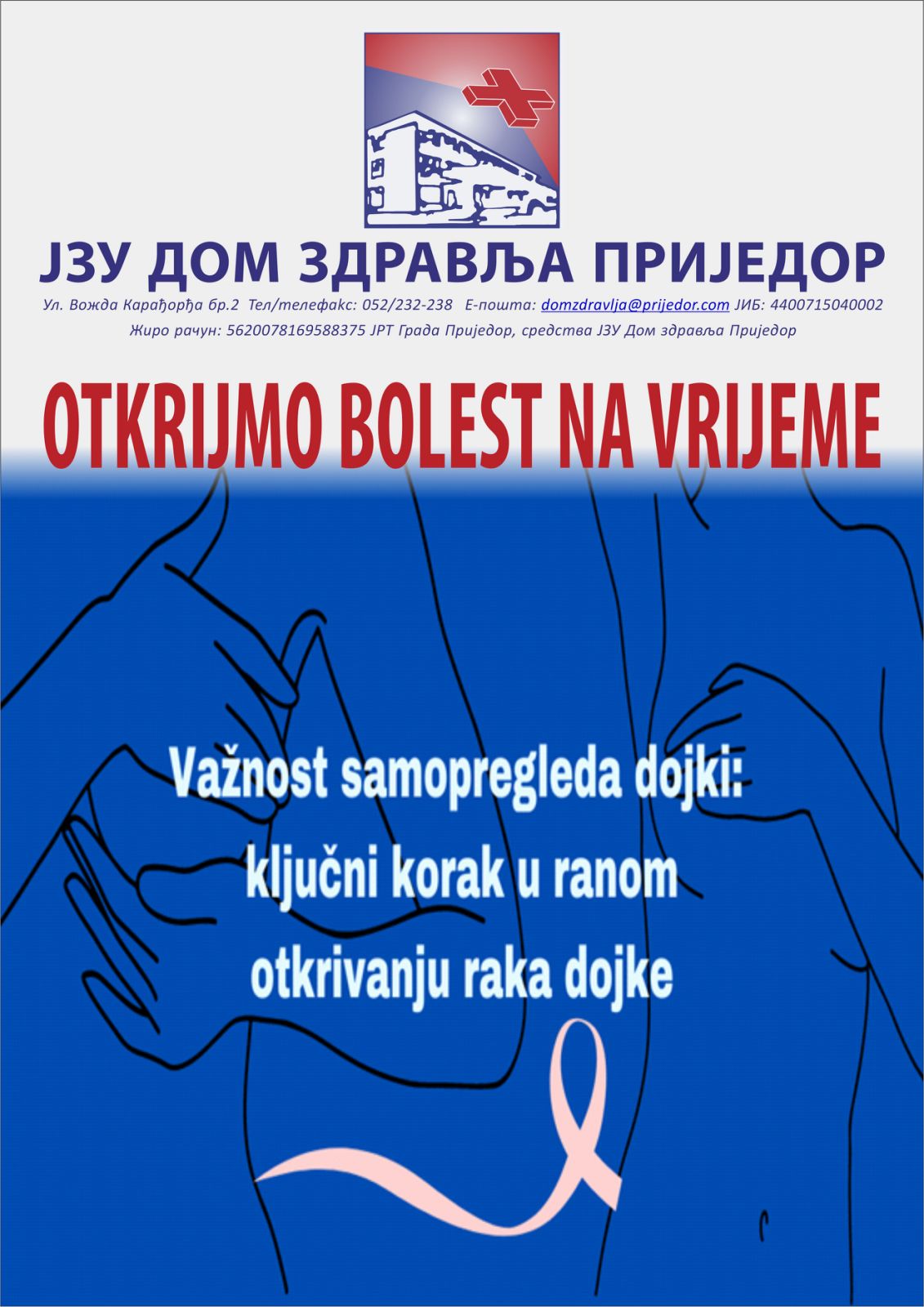 Rubin Milijana, diplomirani medicinar zdravstvene njege i Nadzorna sestra Službe porodične medicine, će demonstrirati i prisutnim ženama pojasniti način samopregleda dojke. Kroz ovakva predavanja JZU Dom zdravlja Prijedor će kontinuirano nastaviti i u budućem periodu raditi na promociji zdravlja, kroz Centar za promociju zdravlja i prevenciju bolesti koji će biti uskoro otvoren u našoj Ustanovi.